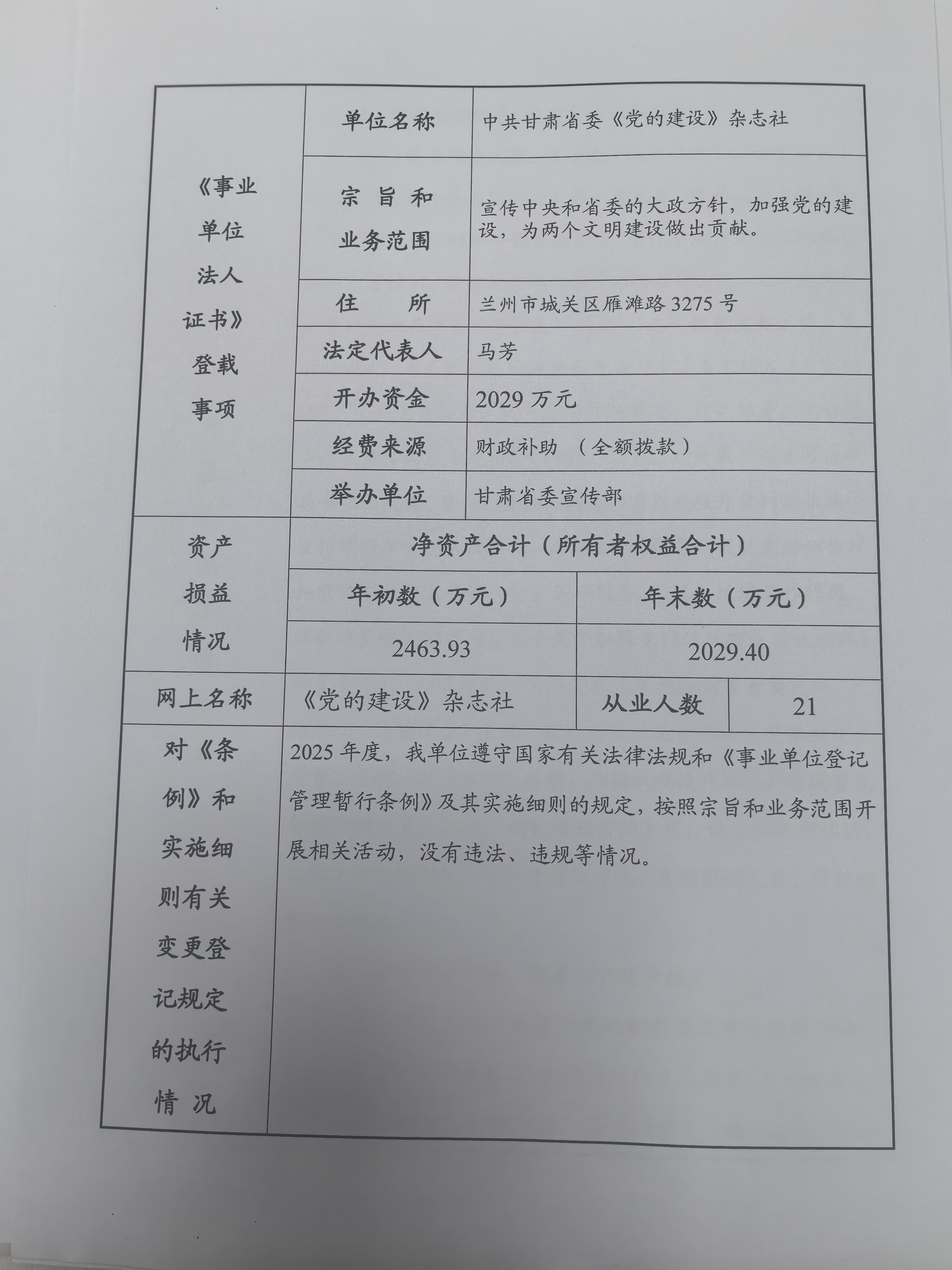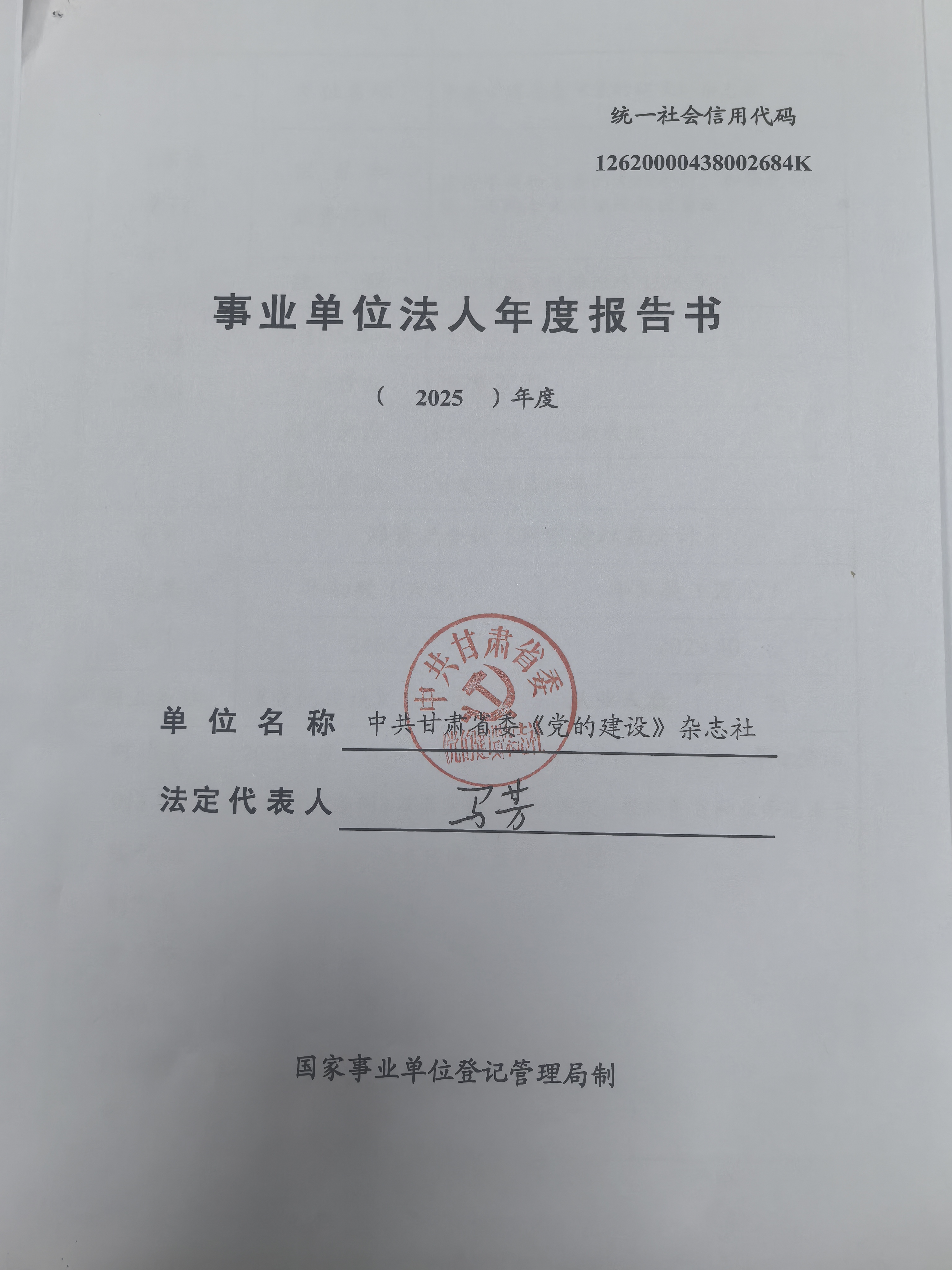 中共甘肃省委《党的建设》杂志社事业单位法人年度报告书公告